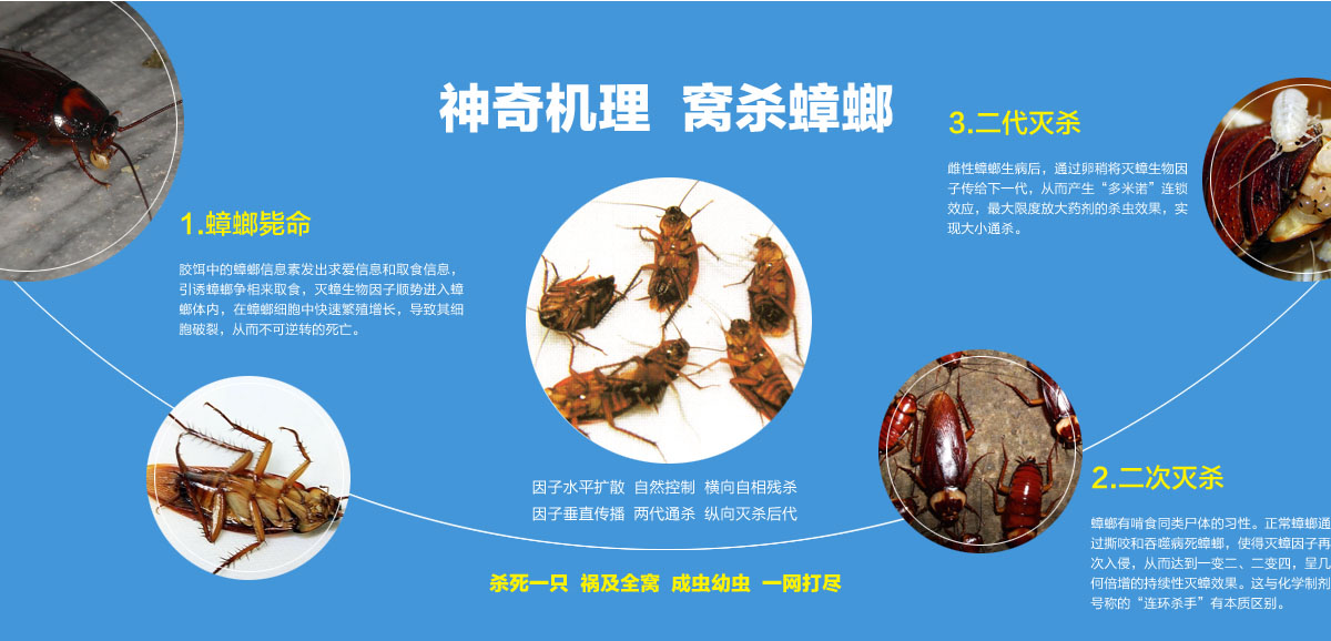 蟑螂信息素向蟑螂發(fā)出致命誘惑,吸引隱匿在巢穴、縫隙內(nèi)的蟑螂爭(zhēng)相取食滅蟑生物因子。通關(guān)過(guò)橫向和縱向雙向出擊,實(shí)現(xiàn)窩殺。對(duì)抗藥性超強(qiáng)的德國(guó)小蠊有特效。